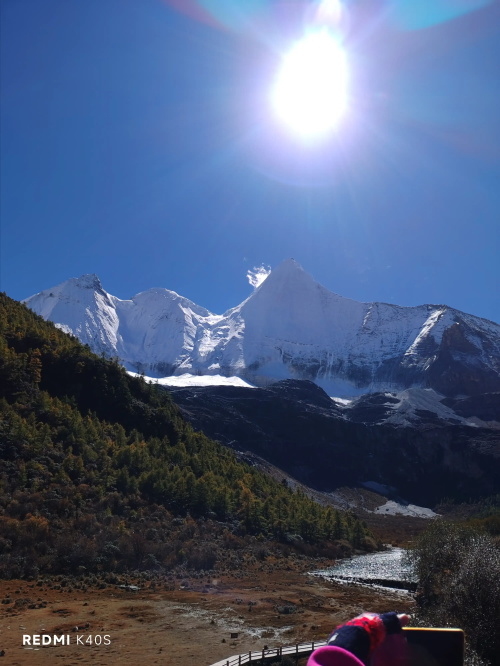 如果你游览过这个风景区,一定会觉得这名字自然贴切。这里确实是距离太阳最近的地方。它有多高多远呢?让我用坐车来回答吧!进入景区,先坐电梯,升高到风景区最低的地方,之后旅游大巴沿山路一直向上爬行,一个多小时之后,来到冲古寺附近。冲古寺海拔接近四千米,但它只是位于神山仙乃日雪峰脚下。