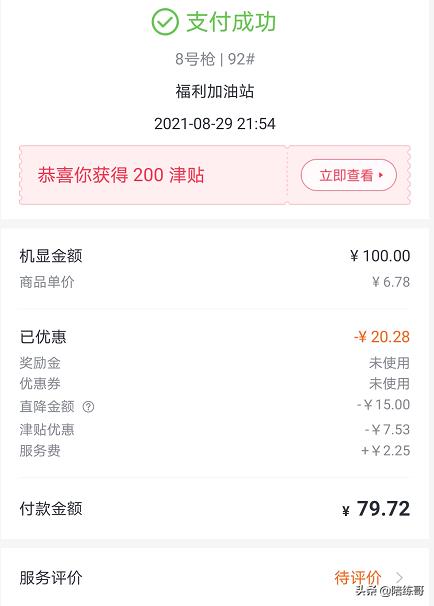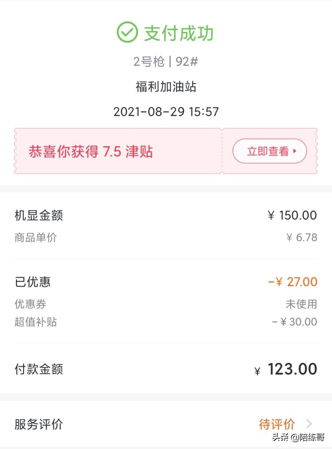 我们可以看到加油站单价是6.78元/升,一次加油150元(优惠27元,实付123元),加油22.12升,一次加油100元(优惠20.28元,实付79.72元),加油14.75升,共计加油250元(优惠47.28元,实付202.72元),加油36.87升,综合算下来,实际付款单价约5.5元/升,优惠了1.28元/升。