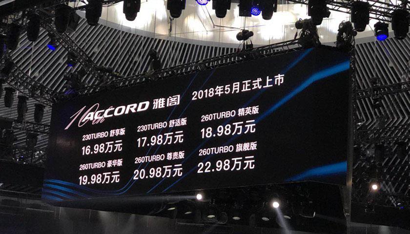 广汽本田第十代雅阁公布售价 6款车型16.98万起