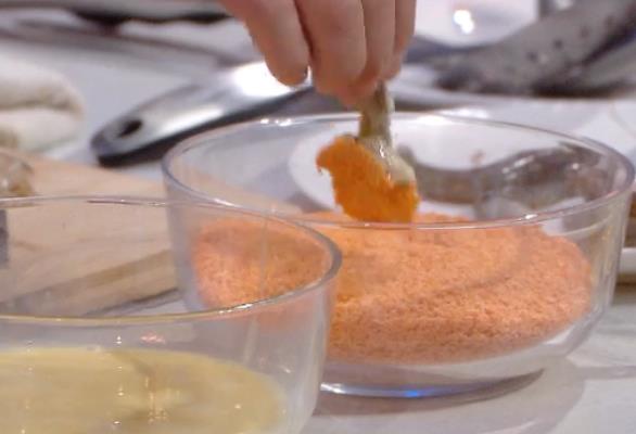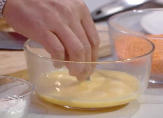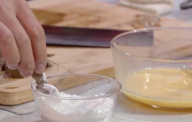 第四步:拍上面粉,裹上鸡蛋,蘸好面包糠