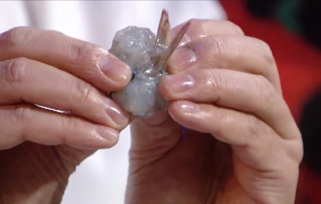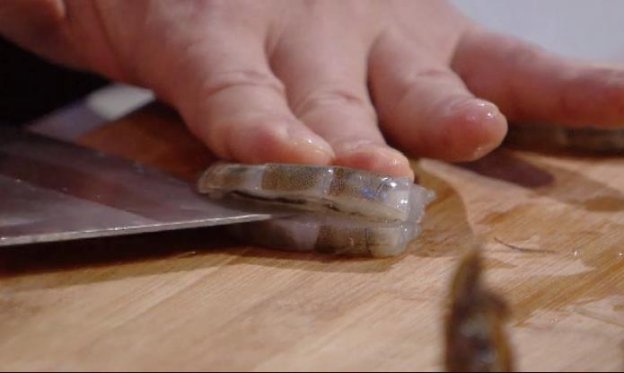 第一步:虾去头,沿虾背中心至虾的最后一节切开,去虾线