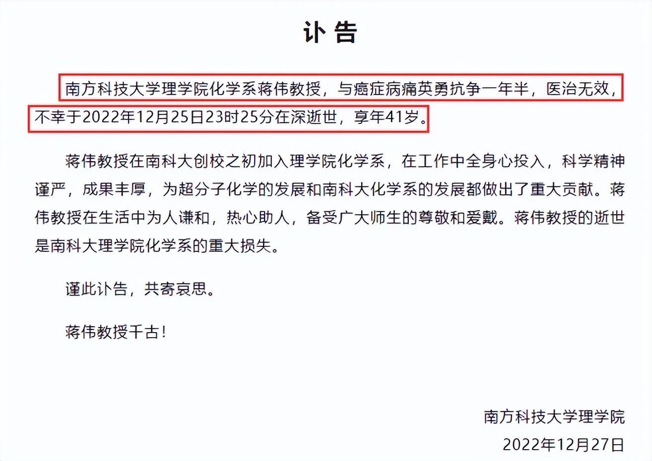 但是现阶段,南方科技大学发布讣告,年仅41岁的南科大教授蒋伟因病去世。这一消息引起了很多网友的关注,南方科技大学的师生们更是感到无比震惊和难过,但是笔者相信他的精神将永远影响着南科大的学生们。