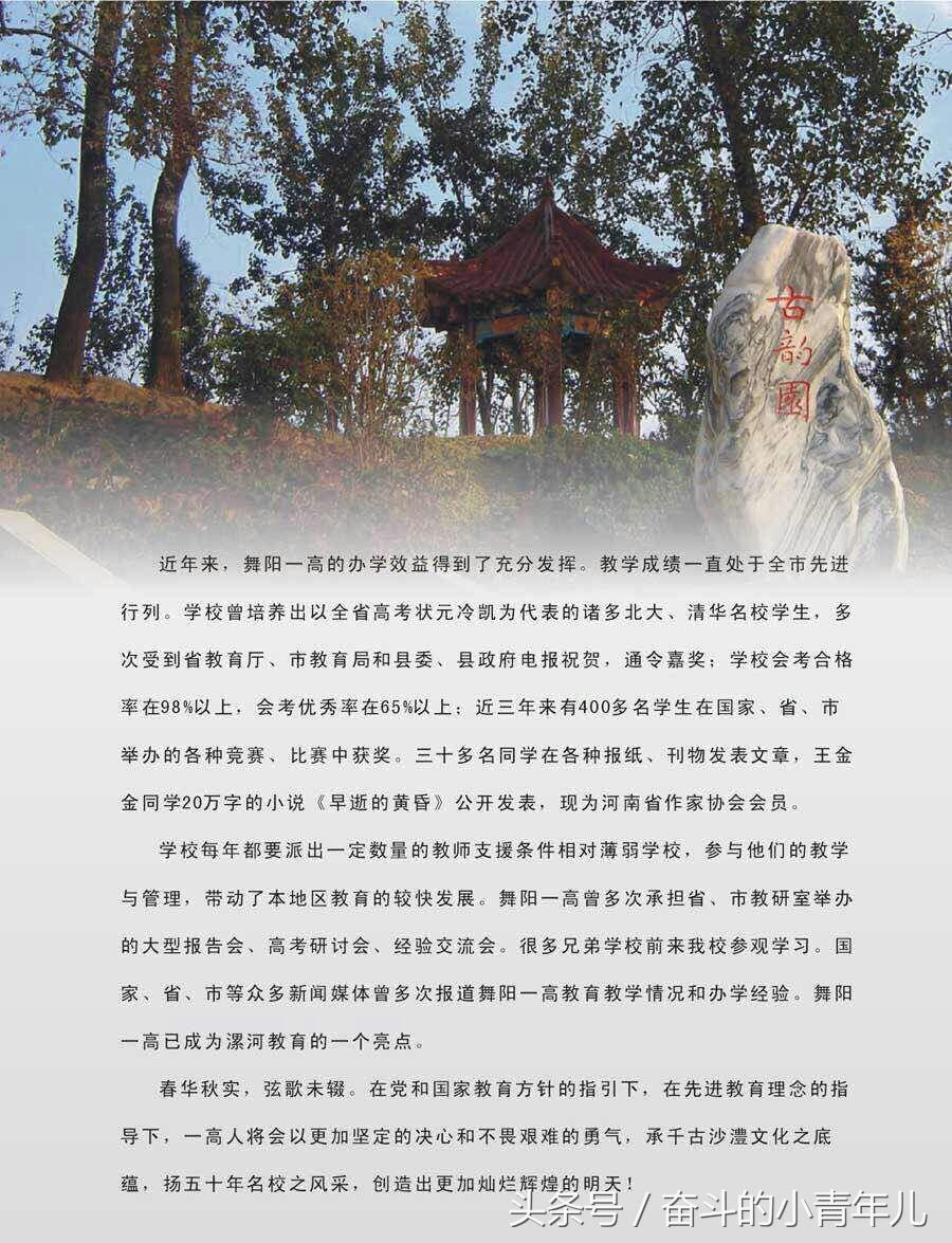 舞阳一高座落于钟灵毓秀的舞阳县城西北隅。属河南省示范性高中。学校现代化教育教学设施设备齐全,功能完善,馆藏图书12万册,报刊杂志200余种。