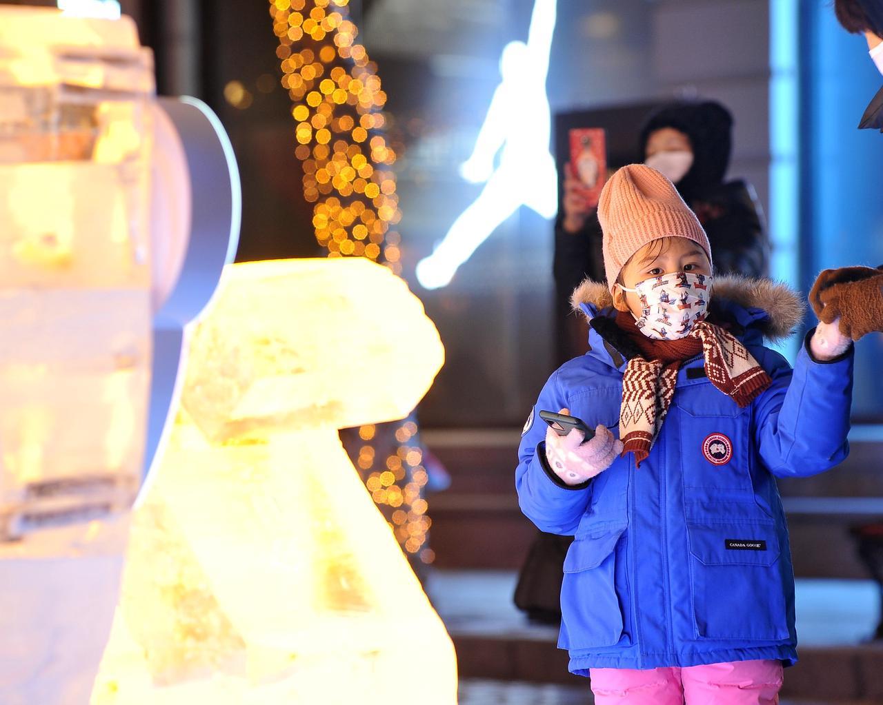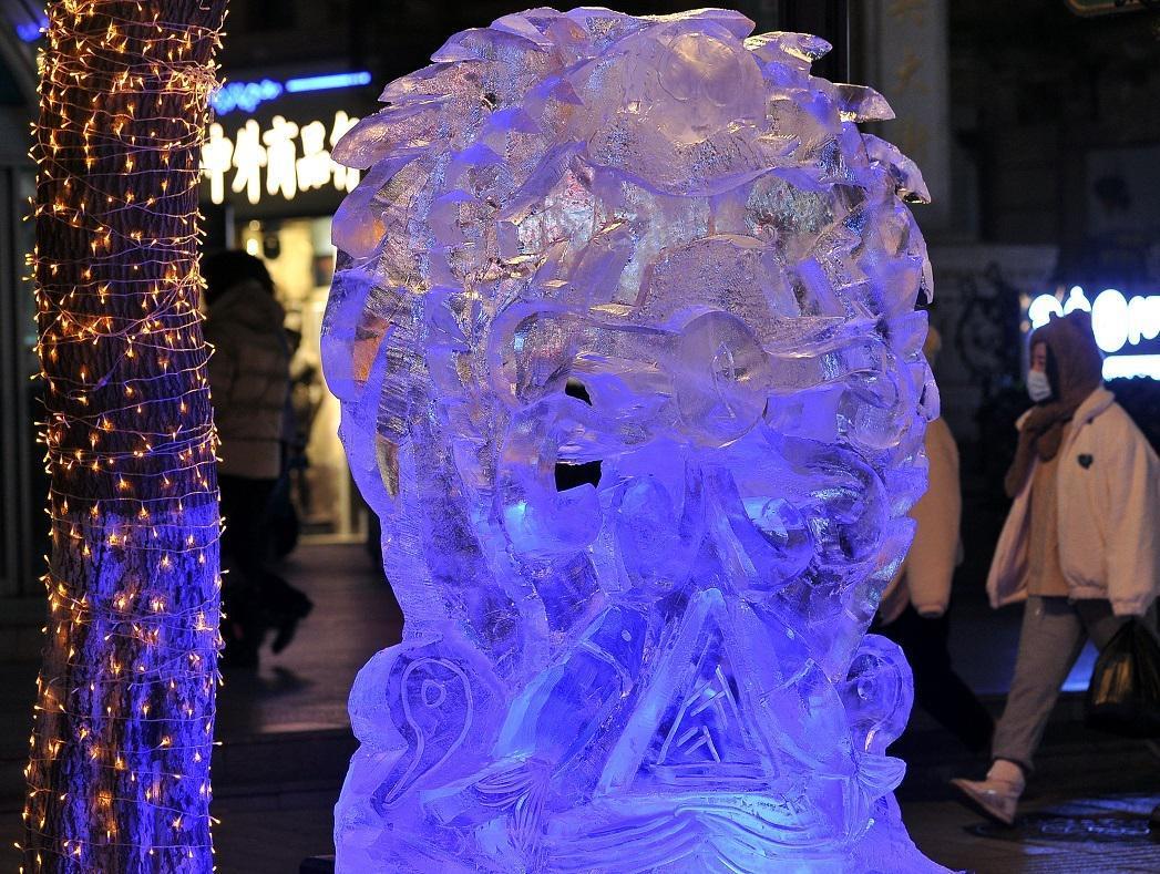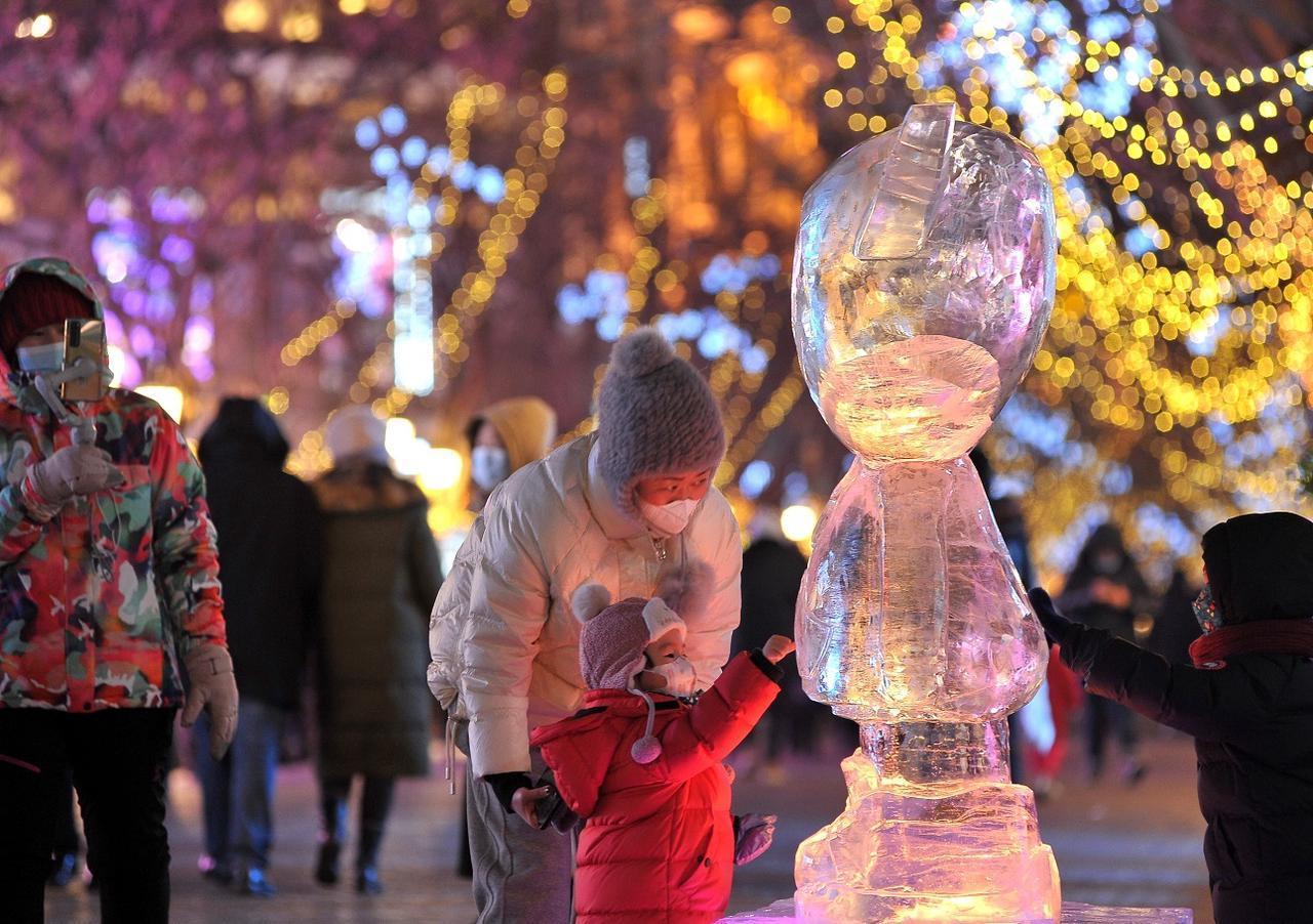 市民们一边逛街购物、品尝美食,一边欣赏大街上美丽的冰灯、彩灯,脸上洋溢着幸福的笑容。