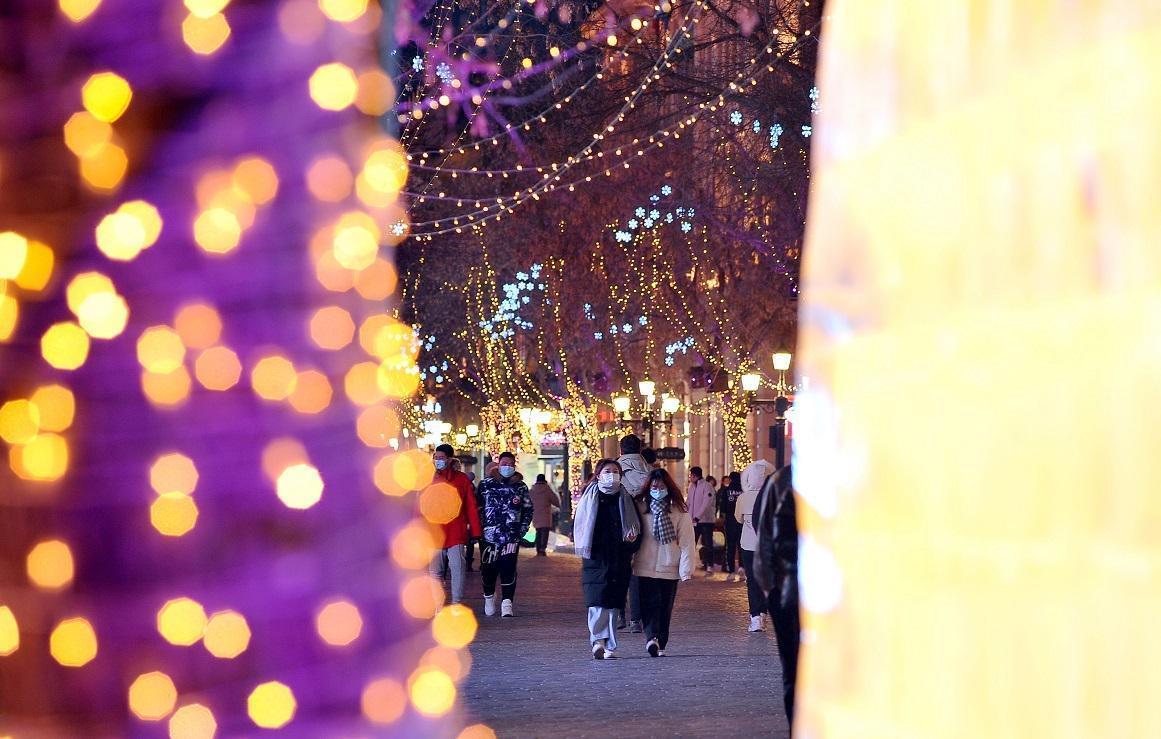 12月28日,夜幕降临,哈尔滨市道里区中央大街上,冰灯、彩灯交相辉映,在两侧欧式建筑衬托下,勾勒出一个迷人浪漫的冬夜。