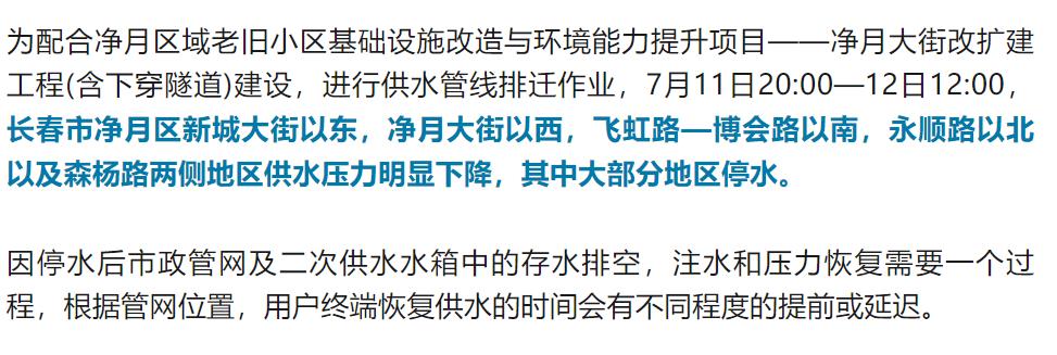 为配合净月区域老旧小区基础设施改造与环境能力提升项目——净月大街改扩建工程(含下穿隧道)建设,进行供水管线排迁作业,7月11日20:00—12日12:00,长春市净月区新城大街以东,净月大街以西,飞虹路—博会路以南,永顺路以北以及森杨路两侧地区供水压力明显下降,其中大部分地区停水。