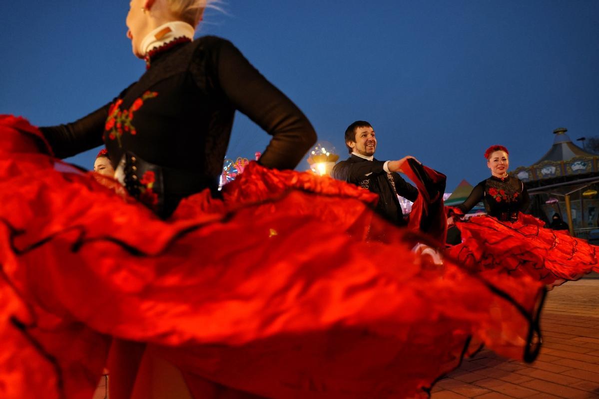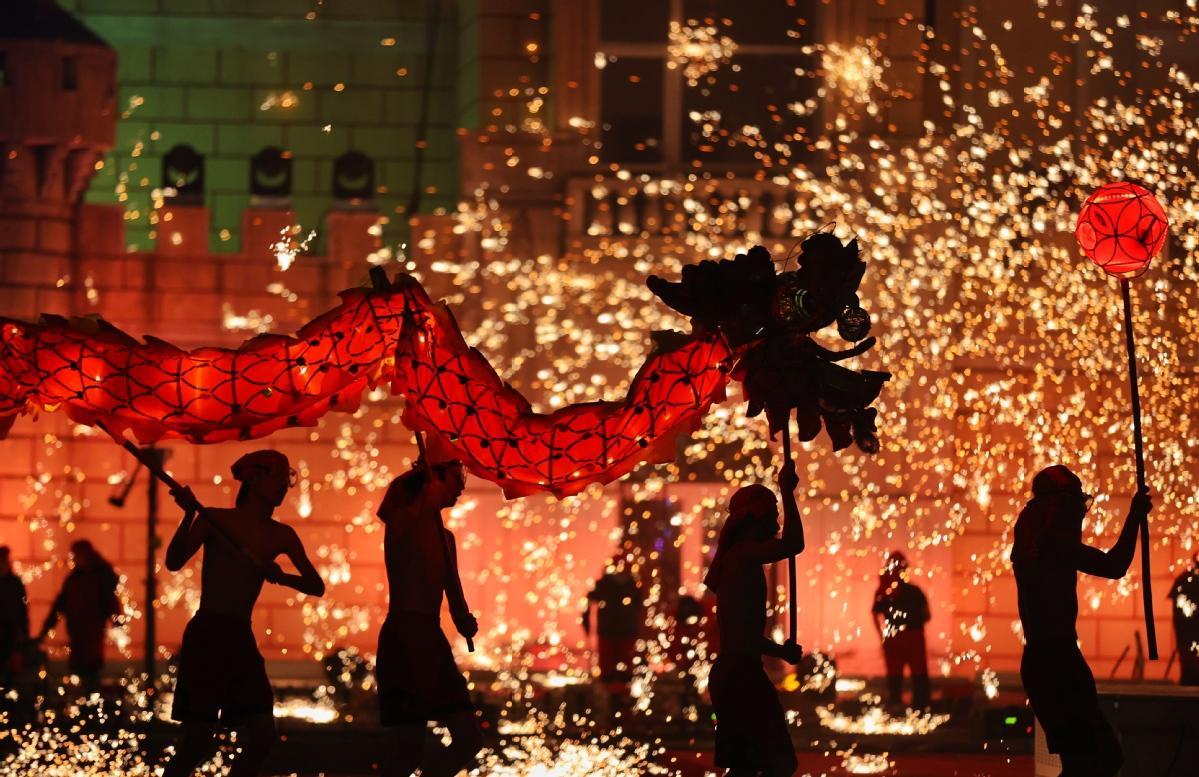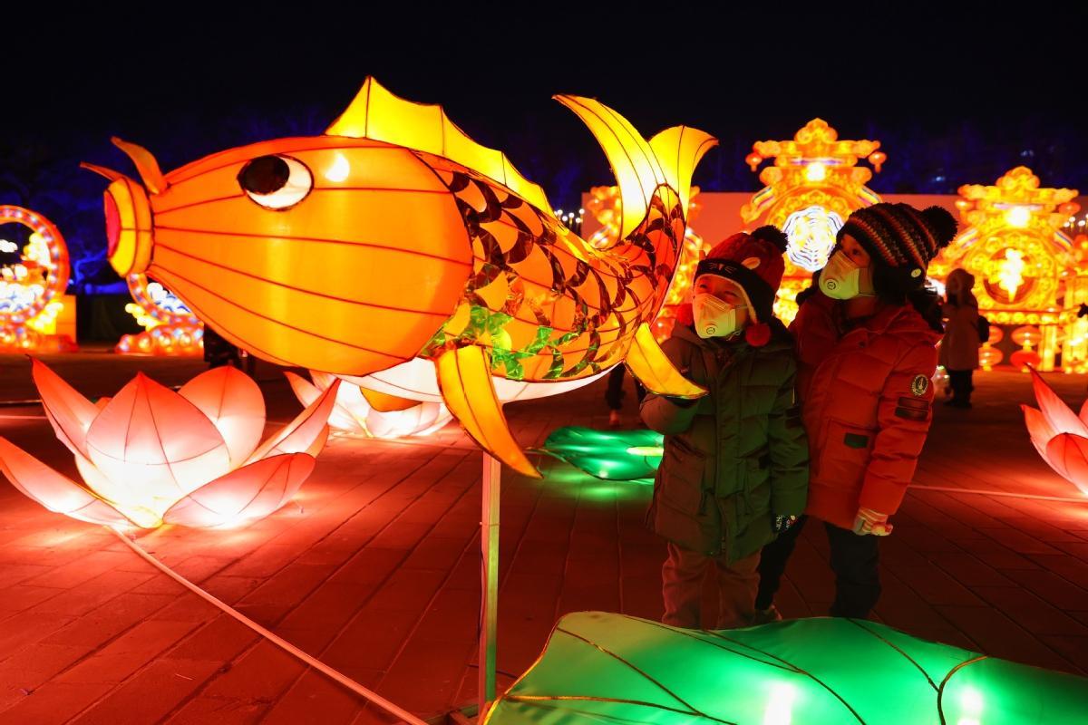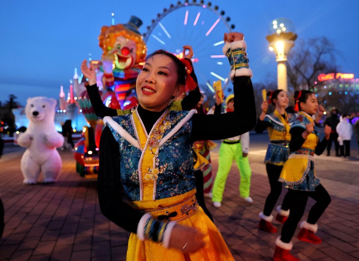中国日报北京1月23日电(记者 姜东) 2023年1月22日晚,北京石景山游乐园,游客欣赏花车巡游。