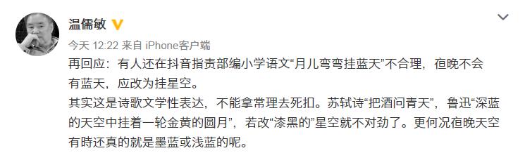 对此,部编本小学语文教材主编温儒敏发微博再回应称: