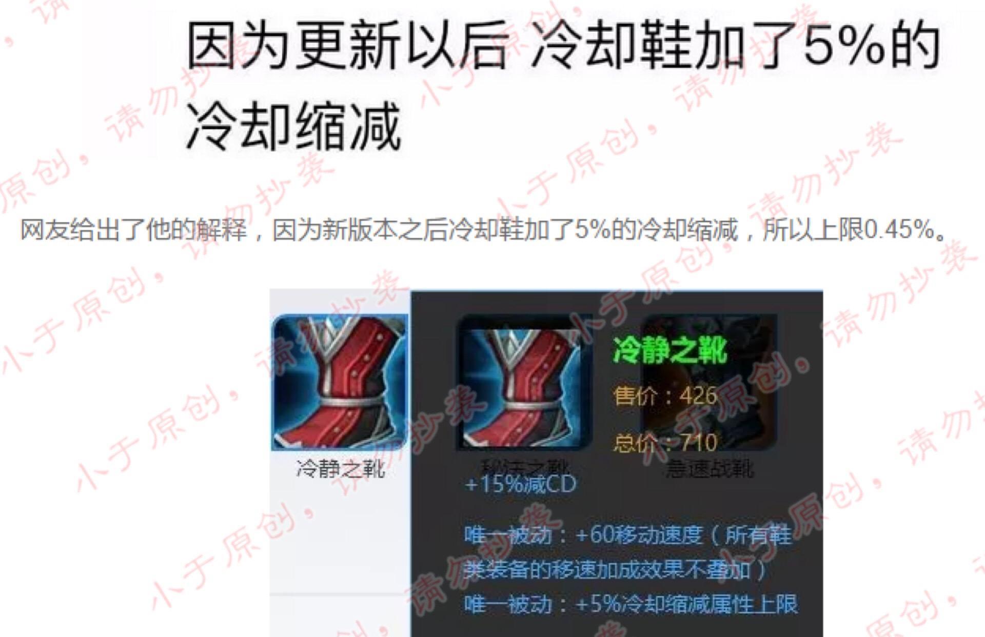 知道装备变化的玩家都知道这是为什么~因为上次装备调整,其中就是冷静之靴,冷静之靴的被动新增加了5%的冷却上限,所以也就是说“冷却缩减”的上限变成了40%;所以这只能说玩家对装备的调整不是很清楚啊~
