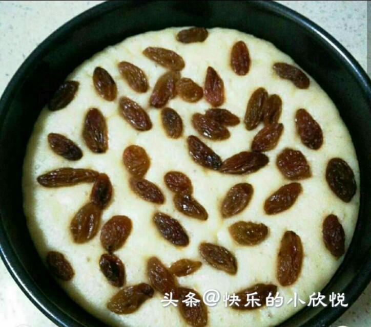 5、二次发酵至两倍大后,面糊的上面放上葡萄干,
