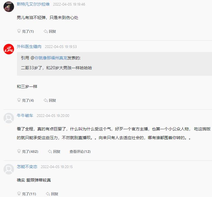 还有网友表示“每天装作一副很努力的样子,结果一句话啰嗦好半天也讲不到点上,没意思,自从看了他的直播好感度快降到0了,真是活在童话世界里的老公主,想想他在饭堂里嘲讽职业选手,哪来的脸哭。”