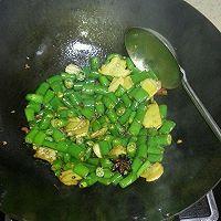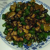 3. 锅内留底油把生姜、大蒜、花椒爆香,然后放入青椒爆炒。最后倒入鸡肉,翻炒几分钟,最后放少量生抽和老抽调味。