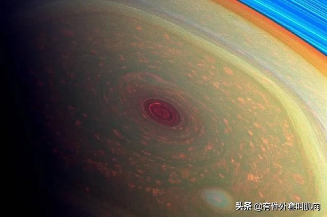 在土星的北极,在两个地球大小的极地六角形,飓风近2000公里宽,风速超过500公里每小时(每小时320英里)。
