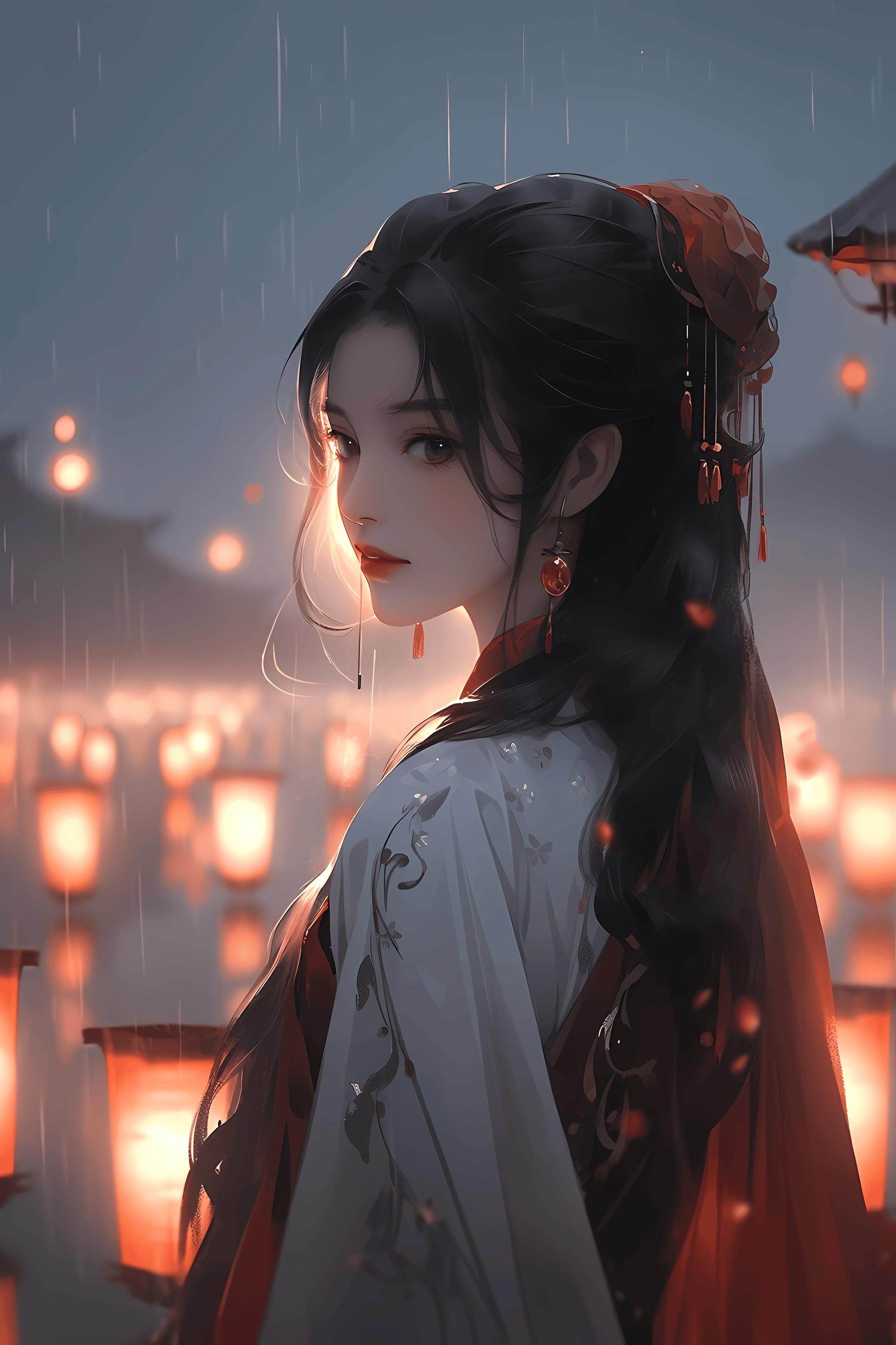 关键词描述:Atmospheric night scene, beside the Qinhuai River, lanterns, foggy and rainy, facing the camera, face close-up, front perspective, a beautiful ancient Chinese girl standing by the river, exquisite face, exquisite clothing, silk, epic style, Elegant backgrounds, high resolution, great clarity, accurate colors, lifelike colors, high fidelity, flawless quality, super detail, detailed characters, high contrast, lifelike, extremely detailed, panorama, cinematic