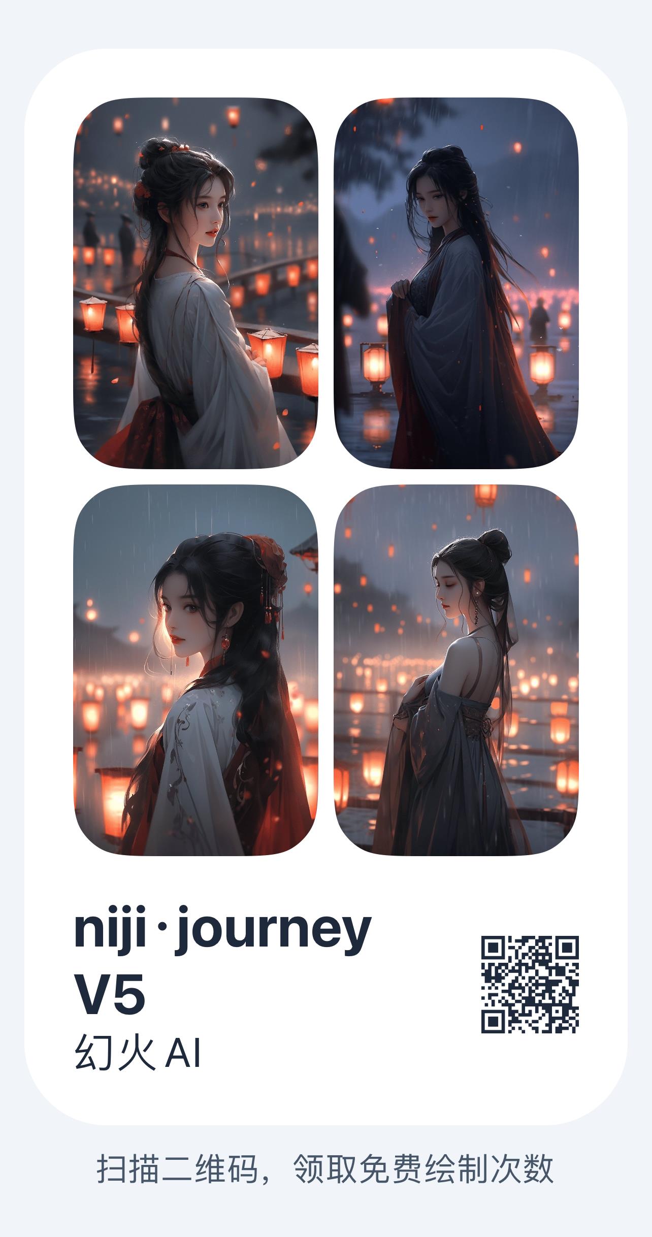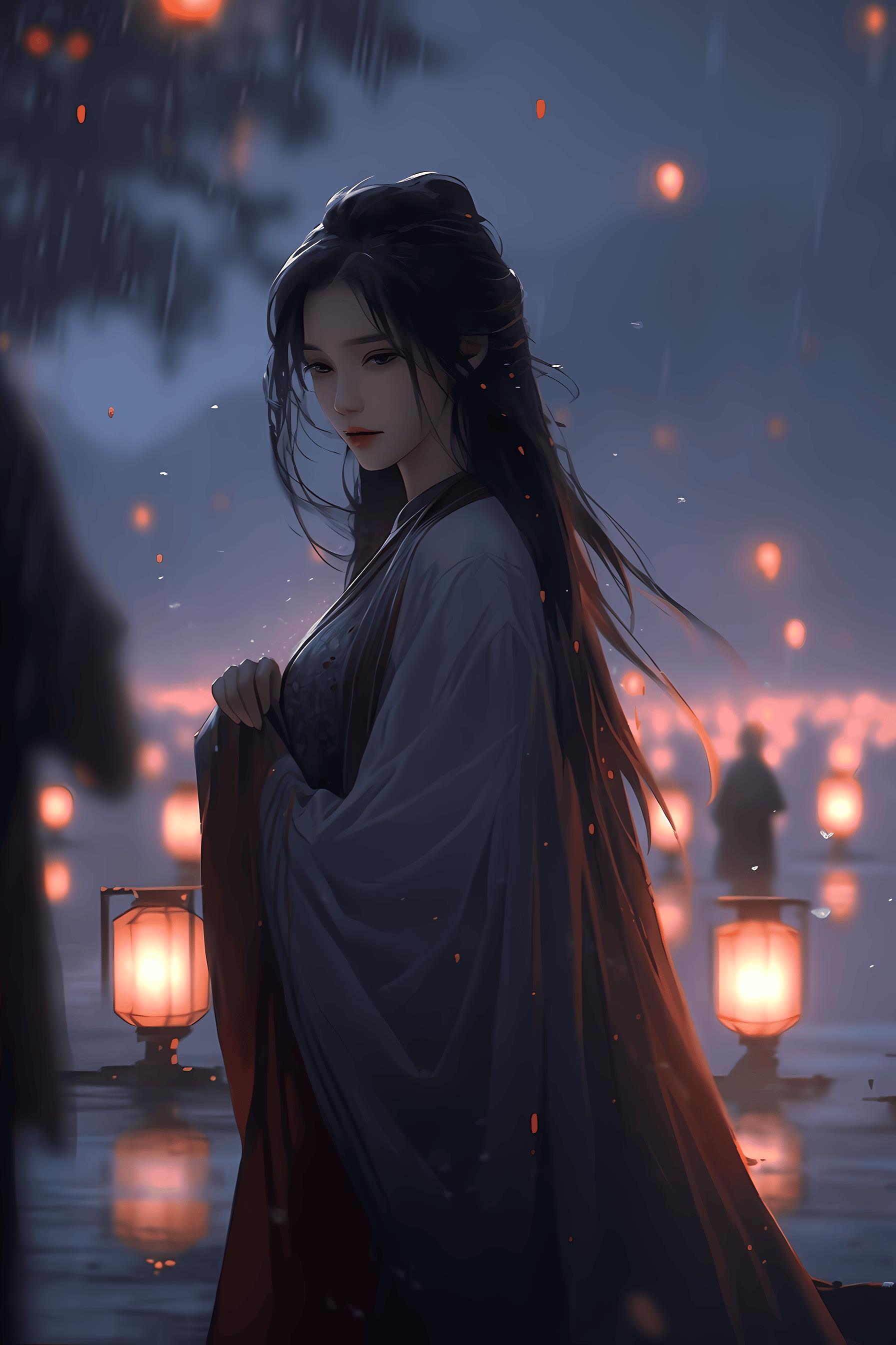 关键词翻译:大气的夜景,秦淮河畔,灯火辉煌,雾蒙蒙,面对镜头,面部特写,正面透视,一个美丽的中国古代女孩站在河边,精致的脸庞,精致的服装,丝绸,史诗般的风格,优雅的背景,高分辨率,大清晰度,准确的色彩,逼真的色彩,高保真度,完美的品质,超级细节,细致的人物,高对比度、逼真、极其细致、全景
