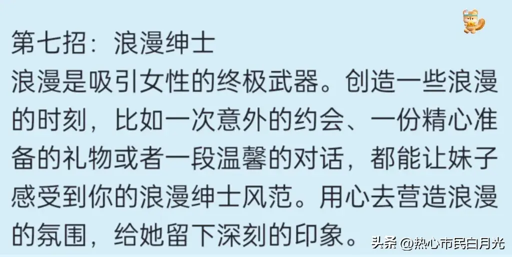 第七招:浪漫绅士 浪漫是吸引女性的终极武器。创造一些浪漫的时刻,比如一次意外的约会、一份精心准备的礼物或者一段温馨的对话,都能让妹子感受到你的浪漫绅士风范。用心去营造浪漫的氛围,给她留下深刻的印象。