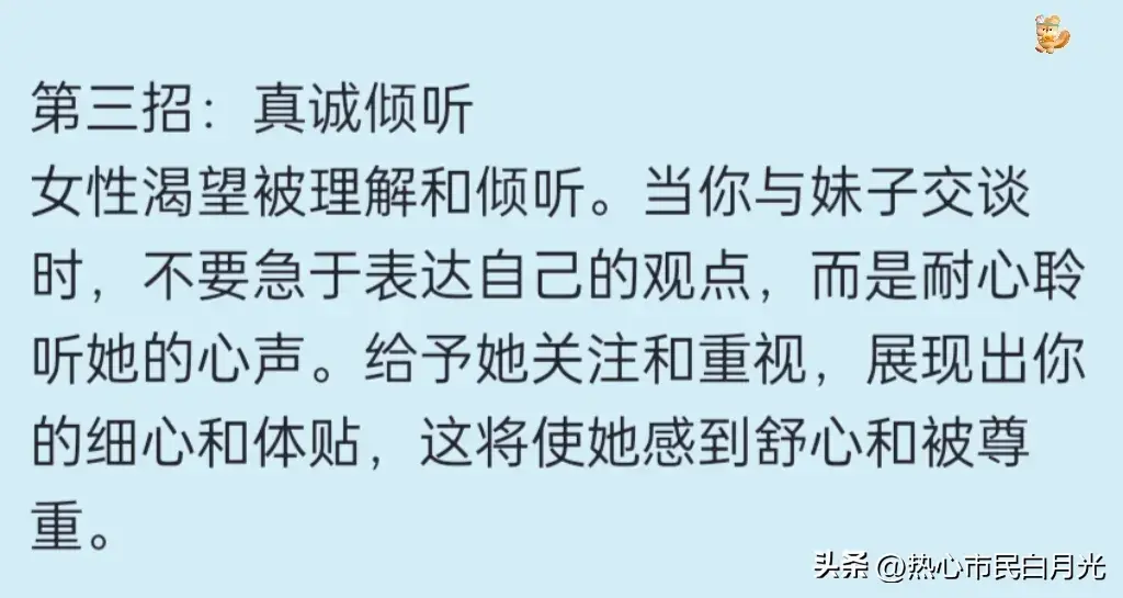 第三招:真诚倾听 女性渴望被理解和倾听。当你与妹子交谈时,不要急于表达自己的观点,而是耐心聆听她的心声。给予她关注和重视,展现出你的细心和体贴,这将使她感到舒心和被尊重。