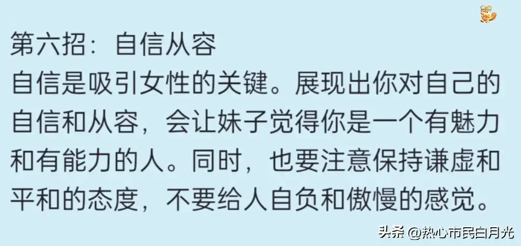 第六招:自信从容 自信是吸引女性的关键。展现出你对自己的自信和从容,会让妹子觉得你是一个有魅力和有能力的人。同时,也要注意保持谦虚和平和的态度,不要给人自负和傲慢的感觉。