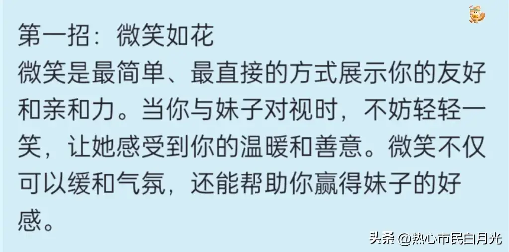第一招:微笑如花 微笑是最简单、最直接的方式展示你的友好和亲和力。当你与妹子对视时,不妨轻轻一笑,让她感受到你的温暖和善意。微笑不仅可以缓和气氛,还能帮助你赢得妹子的好感。