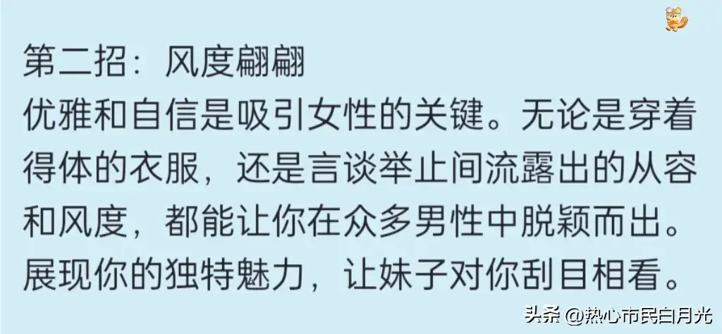 第二招:风度翩翩 优雅和自信是吸引女性的关键。无论是穿着得体的衣服,还是言谈举止间流露出的从容和风度,都能让你在众多男性中脱颖而出。展现你的独特魅力,让妹子对你刮目相看。