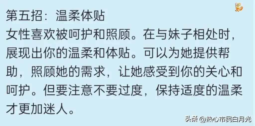 第五招:温柔体贴 女性喜欢被呵护和照顾。在与妹子相处时,展现出你的温柔和体贴。可以为她提供帮助,照顾她的需求,让她感受到你的关心和呵护。但要注意不要过度,保持适度的温柔才更加迷人。