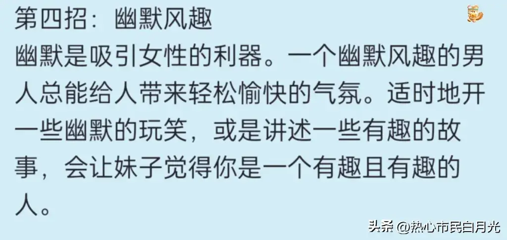 第四招:幽默风趣 幽默是吸引女性的利器。一个幽默风趣的男人总能给人带来轻松愉快的气氛。适时地开一些幽默的玩笑,或是讲述一些有趣的故事,会让妹子觉得你是一个有趣且有趣的人。