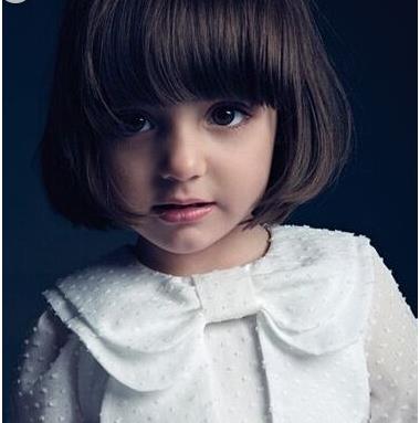 刚上小学的女孩脸庞肉肉的显得有些大,梳理这款齐刘海波波头短发,厚厚的刘海与蓬松的侧边发丝环绕着大脸,将女孩的脸庞修饰成甜美圆脸,尤其是刘海下面的大眼睛,好漂亮有灵气呢。