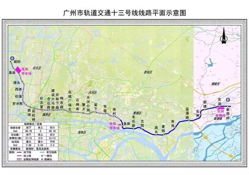 广州地铁十三号线二期,东起首期黄埔区鱼珠站,西至白云区朝阳站,线路总长为33.5公里,均为地下线敷设方式,共设置23座车站,23座车站中有9座车站可换乘其他线路。