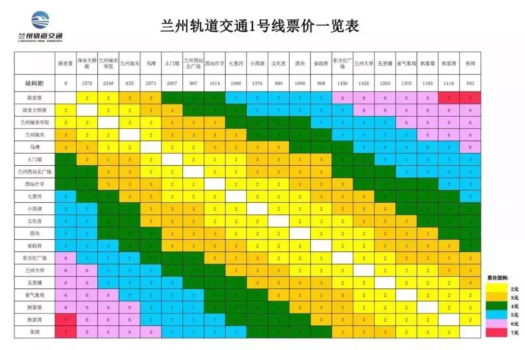 兰州市轨道交通票制票价方案将采用“里程分段计价”,起步价2元,起步里程4公里,1号线全线最高票价7元。