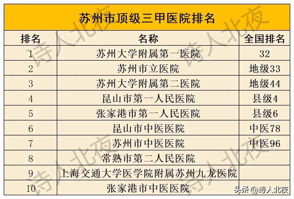 以上是苏州市顶级三甲医院10强,其中领军者是苏州大学附属第一医院,是苏州市唯一进入全国顶级医院百强的医院,并且高居第32位,其他例如:苏州市立医院、苏州大学附属第二医院同样位列全国地级市医院50强,这三所医院代表着苏州市最优质的医疗资源!