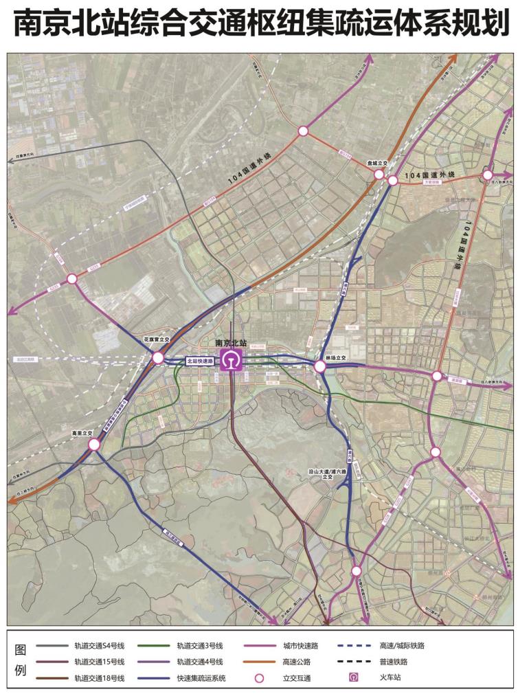 南京北站紧邻地铁3号线林场站,位居老山以北,未来将建设以“轨道集疏运为主,道路集疏运为辅”的综合集疏运体系。《规划》中,轨道交通S4号线南京段、3号线四期、4号线三期,道路交通北站快速路,力争与南京北站同步建成投用。