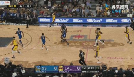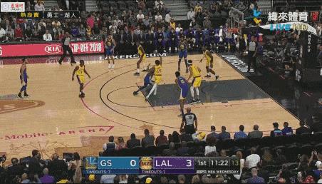 第一节,先是波普三分拿下一血,3-0,接着杜兰特上篮得手3-2;接着湖人连得4分,6-2;