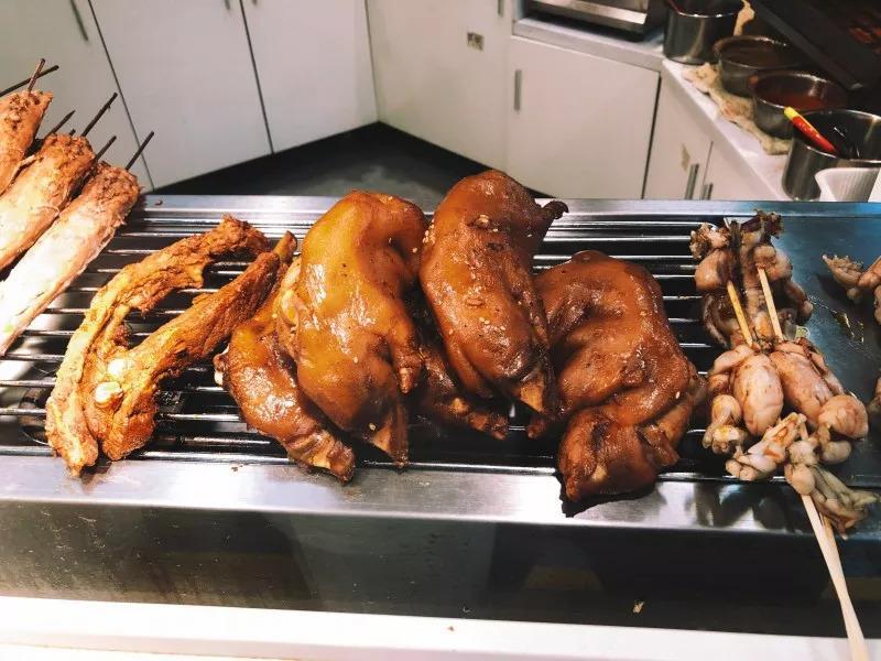 碳烤肉类,品种选择性不多,但是烤猪蹄烤鸭脖算是主打。