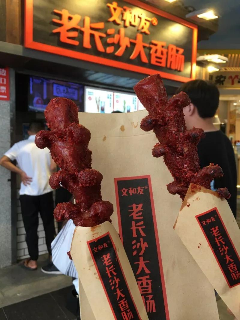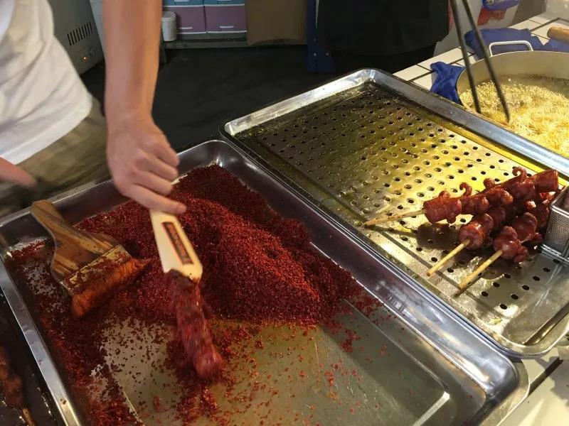 口感偏向于甜味的广式腊肠,同样是色泽明亮、香味醇厚,炸至焦脆再放入红红的辣椒粉中,裹上一层厚厚的辣椒。