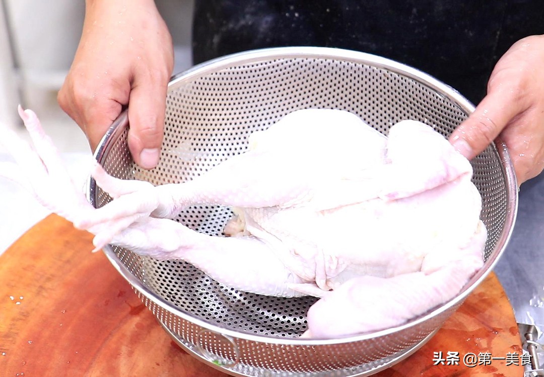 准备三黄鸡一只,已经提前宰杀干净,去除油脂、气管、淋巴结,把鸡身里里外外清洗干净,去除鸡脚趾剁掉鸡爪,把鸡放在通风的地方晾干水分备用。