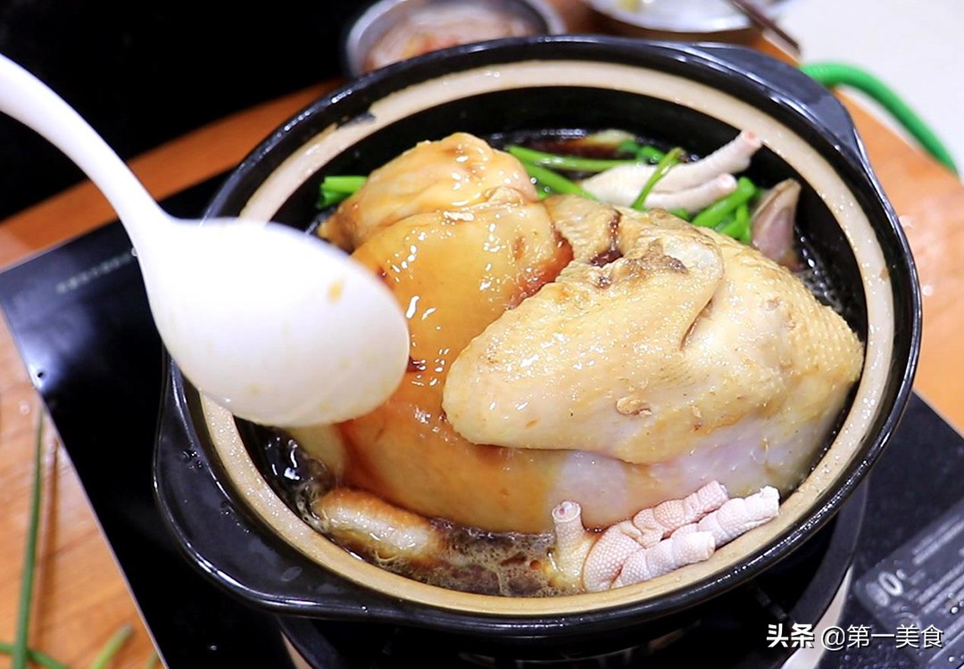 ,再放入一个葱结,几粒冰糖,鸡爪也放进去,开火以后在鸡身上淋上一些汤汁,盖上锅盖转小火炖25分钟。