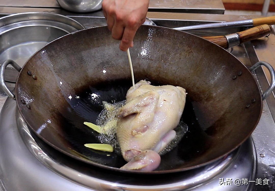 把锅烧热,加入植物油润锅,倒出热油加入凉油,再放入几片生姜爆香,把鸡放入锅中在鸡身上扎一些小孔,方便煎透入味,保持小火经常翻面,把鸡皮煎成金黄色即可。
