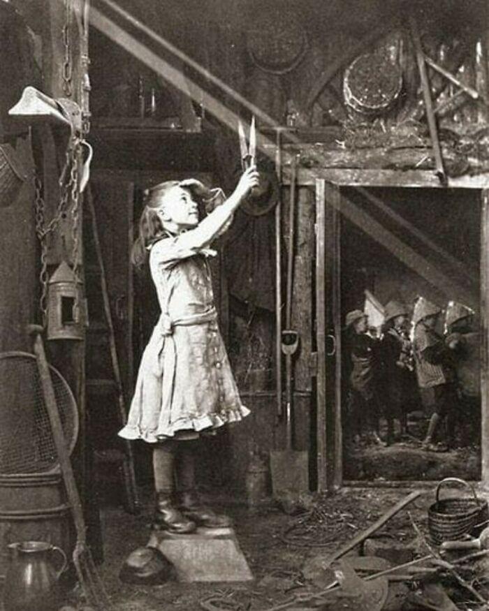 一个年轻女孩试图切断阳光。这张照片是亚当·迪斯顿在1886年拍摄的