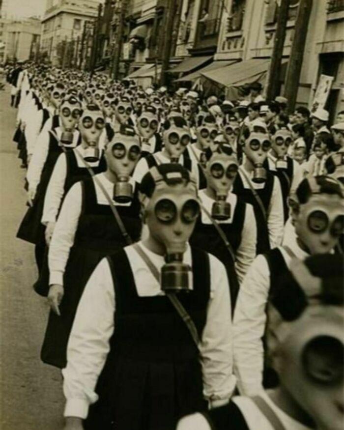 戴着防毒面具的女学生。二次世界大战