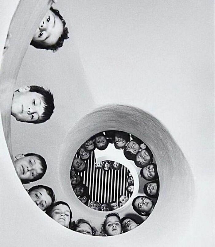 法国克拉马特新建的儿童图书馆里,孩子们在旋转楼梯上。马丁·弗兰克于1965年拍摄的照片