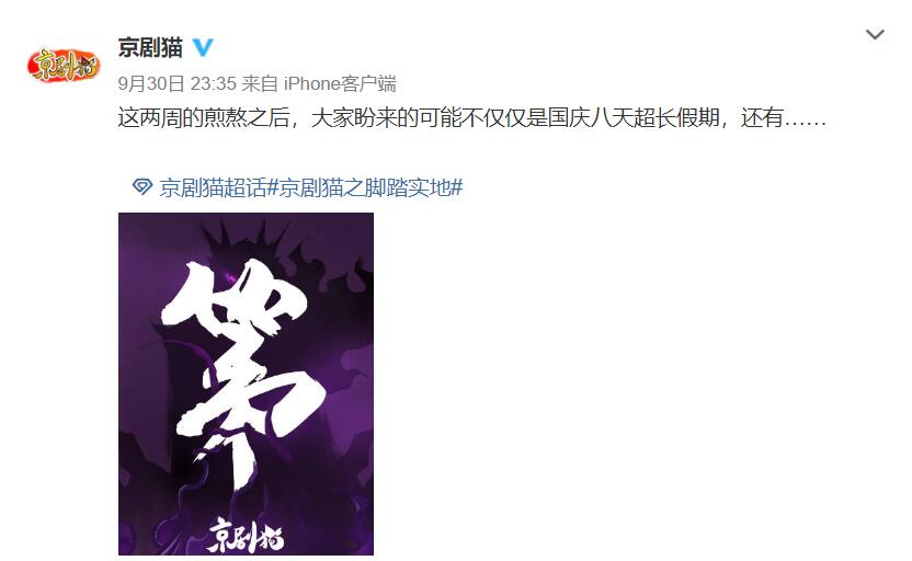 结果小编惊人地发现,停更了两个多月的京剧猫官微,突然在9月27号和30号发了两条微博,京剧猫开始做宣发了?