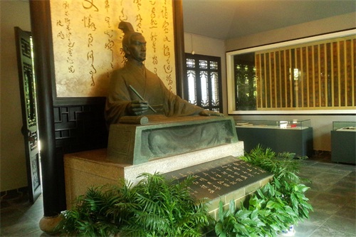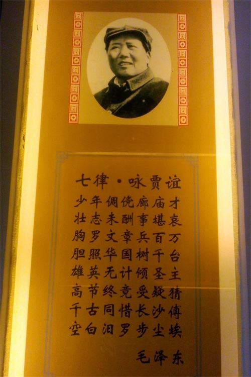 塑像两旁墙上装饰《过秦论》竹简,《过秦论》是贾谊政论散文的代表作,分上中下三篇。竹简下面的玻璃柜内陈列着贾谊的研究著作,我知之甚少。
