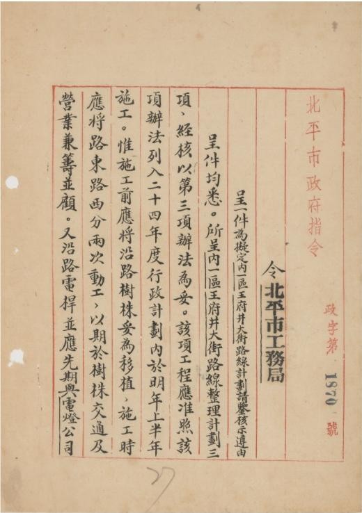 北平市政府关于修缮王府井大街路线计划给市工务局的指令