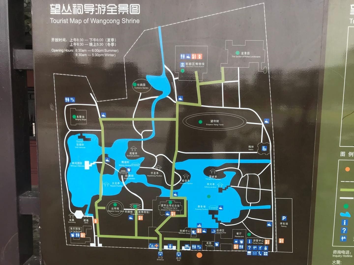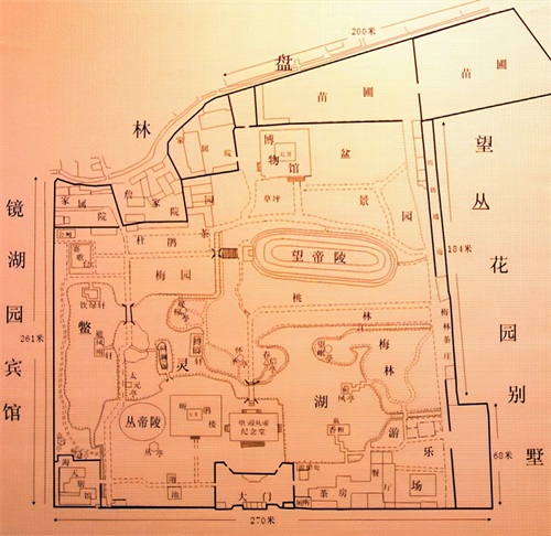 馆内四壁,是古蜀之光——天府源“梦回古蜀”系列展。展览共分前言、千古帝祠、千秋伟业、功德永祀、珍贵记忆、结束语五部分,不仅展示了望丛二帝的千秋伟业,也展示了望丛祠的沧桑历史。 据了解,相传望帝杜宇教民务农,丛帝开明为民治水,二帝遗爱于民,受到后人尊祀。最早,望帝祠和丛帝祠是分设分祀的,望帝祠原在玉垒山麓(今都江堰市二王庙处),叫崇德祠。南北朝齐明帝时(494—498年),才迁至郫县与丛帝庙合并,始称望丛祠。此后,望丛祠在历代都得到修缮扩建:北宋仁宗康定二年(1041年),邑令赵可度“葺而新之”;宋皇祐四年(1052年)重修;明末清初,望丛祠为战火所毁,仅剩下杜宇鳖灵二坟;清道光十四年(1834年)重修,占地22亩;光绪三十三年(1904年)建“听鹃楼”;民国四年(1915年),曾于祠后修建公园,后逐渐荒废;民国八年(1919年),督军熊克武驻扎在此,又拨款培修祠宇;1984年以后,郫县政府对望丛祠进行了大规模维修和扩建,不仅开挖了鳖灵湖,还在湖中、岸上建设了许多亭榭,并培修了望帝、丛帝陵,美化了园林、通道,使望丛祠面积扩大至82亩,至此,望丛祠基本格局初步形成。下图是望丛祠平面图。