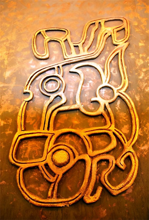 望丛帝塑像背后的这个图案,是蜀王印。据说,这个蜀王印是根据1980年在新都马家场一座战国时期的蜀王墓中出土的一件石刻制作的。从整个印的图纹来看,上是朱雀,下是玄武,左是青龙,右是白虎,中间下部是垒,全是象形文。据考古专家推测,这件石刻是氏族的标志,可能就是蜀王印,是古蜀国王权的象征。