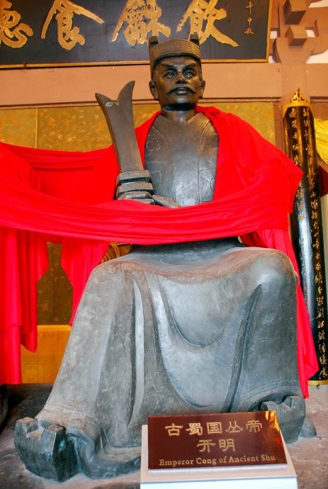望帝积百余岁,荆有一人,名鳖灵,其尸亡去,荆人求之不得。鳖灵尸随江水上至郫,遂活,与望帝相见。望帝以鳖灵为相。时玉山出水,若尧之洪水。望帝不能治,使鳖灵决玉山,民得安处。鳖灵治水去后,望帝与其妻通。惭愧,自以德薄不如鳖灵,乃委国授之而去,如尧之禅舜。鳖灵即位,号曰开明帝。帝生卢保,亦号开明。以上便是对丛帝的记录。
