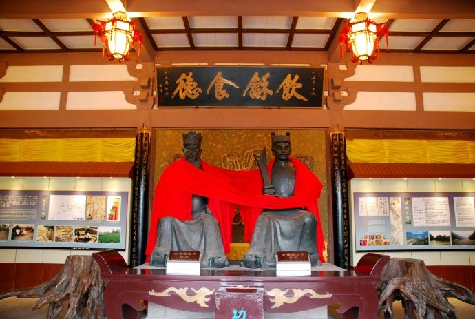 纪念馆正中,是望帝、丛帝的青铜塑像。上悬一匾:饮和食德。“饮和”语出《庄子·则阳》:“故或不言而饮人以和”;“食德”语出《周易·讼》:“六三,食旧德”。“饮和食德”的意思是说,给人吃喝后感觉到自在、享受和快乐,享受到先人的德泽。