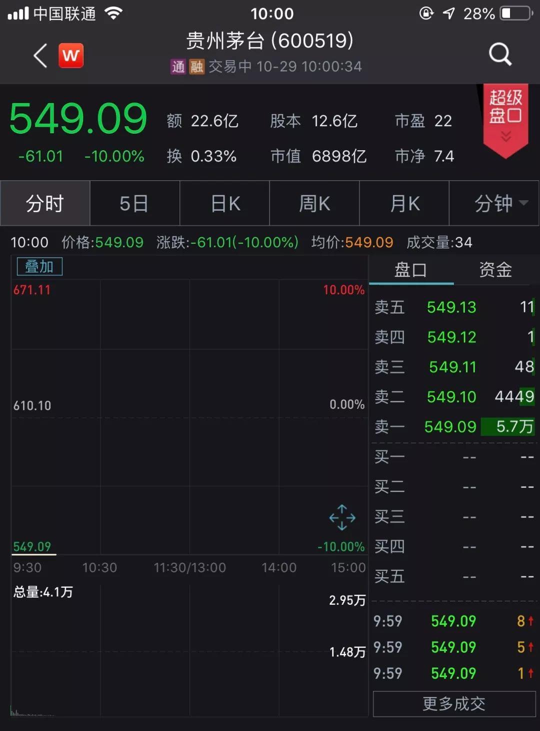 受三季度业绩不及预期影响,今日(10月29日)贵州茅台开盘跌停,股价创一年新低,跌破600元大关,报549元/股,市值蒸发近900亿元。跌停板封单高达5.4万手,约人民币30亿元,也连带白酒板块市值缩水1300亿元。