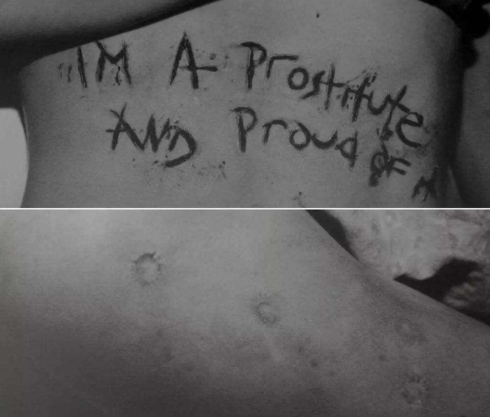 于是,歇斯底里的格特鲁德用烧红的铁针在西我维娅的腹部烙当前“I'M A PROSTITUTE AND PROUD OF IT(我是一个妓女并以此为荣)”的句语,并抑制在场的儿童一齐介入这场消失人情的犯法。