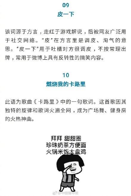 【快来看!2018十大网络用语出炉】12月19日,国家语言资源监测与研究中心发布了“2018年度十大网络用语”。它们依次为:锦鲤、杠精、skr、佛系、确认过眼神、官宣、C位、土味情话、皮一下、燃烧我的卡路里。这些网络用语有什么内涵?它们为何能当选“2018年度十大网络用语”?快来一起看看!(来源:新华社、教育部新闻办)